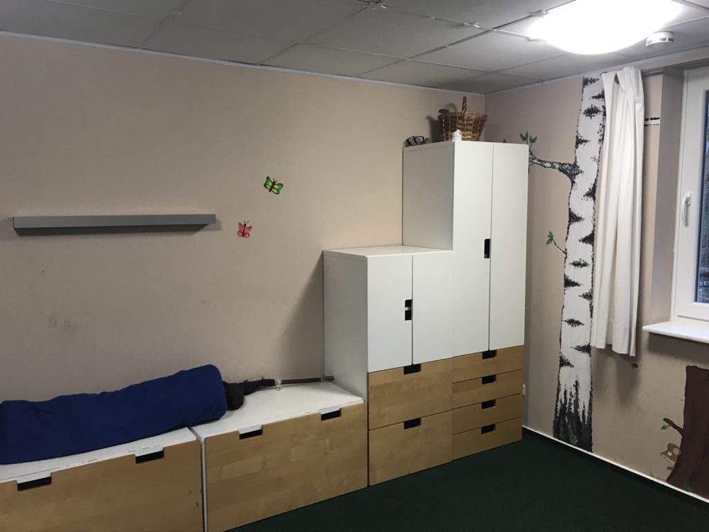 Der Schlafraum schließt sich an den Gruppenraum an und ist als einziger Raum mit Teppich ausgelegt. Hier steht eine Schrankwand, in der verschiedene Spielmaterialien zu finden sind. Für die Krippenkinder gibt es fünf kleine Schaumstoffbetten, in denen sie ihren Mittagsschlaf halten können. Außerhalb der Schlafzeiten wird dieser Raum auch gerne zum Spielen und für verschiedene Angebote genutzt.