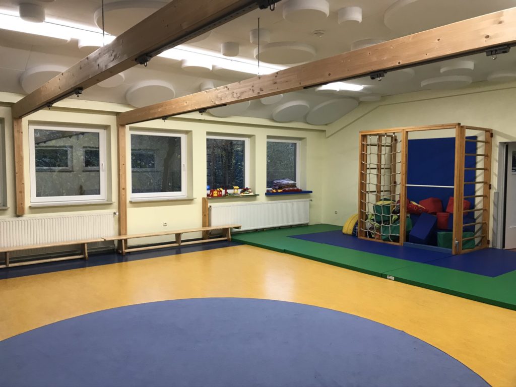 Der Mehrzweckraum enthält zwei unterschiedliche Kletterwände, ein Regal mit Bällen, Seilen und anderen Bewegungsmaterialien. Es gibt Turn – und Weichbodenmatten, Turnbänke und viele Schaumstoffelemente. Außerdem bietet der Raum viel Platz, um Verschiedenes für die Kinder und mit den Kindern aufzubauen. 2012 wurde ein Balken- und Schienensystem angeschafft. Hieran können Schaukeln, Seile, Hängematten uvm. flexibel montiert werden. In der Mitte liegt ein großer runder Teppich, auf dem in der Regel der Morgenkreis stattfindet.