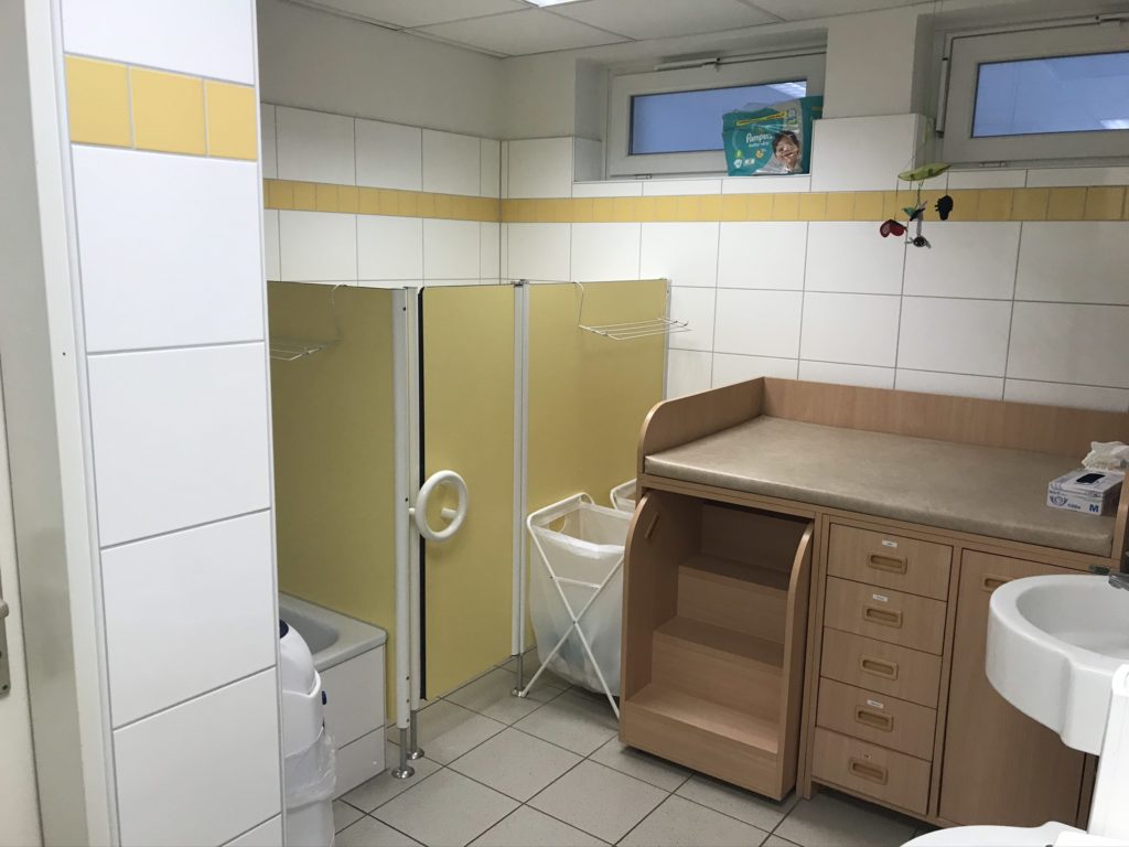 - Sanitärbereich, der sich unterteilt in Wickelraum, „Krippen-Toilette“ und Dusche, sowie Kindertoiletten und eine Personaltoilette